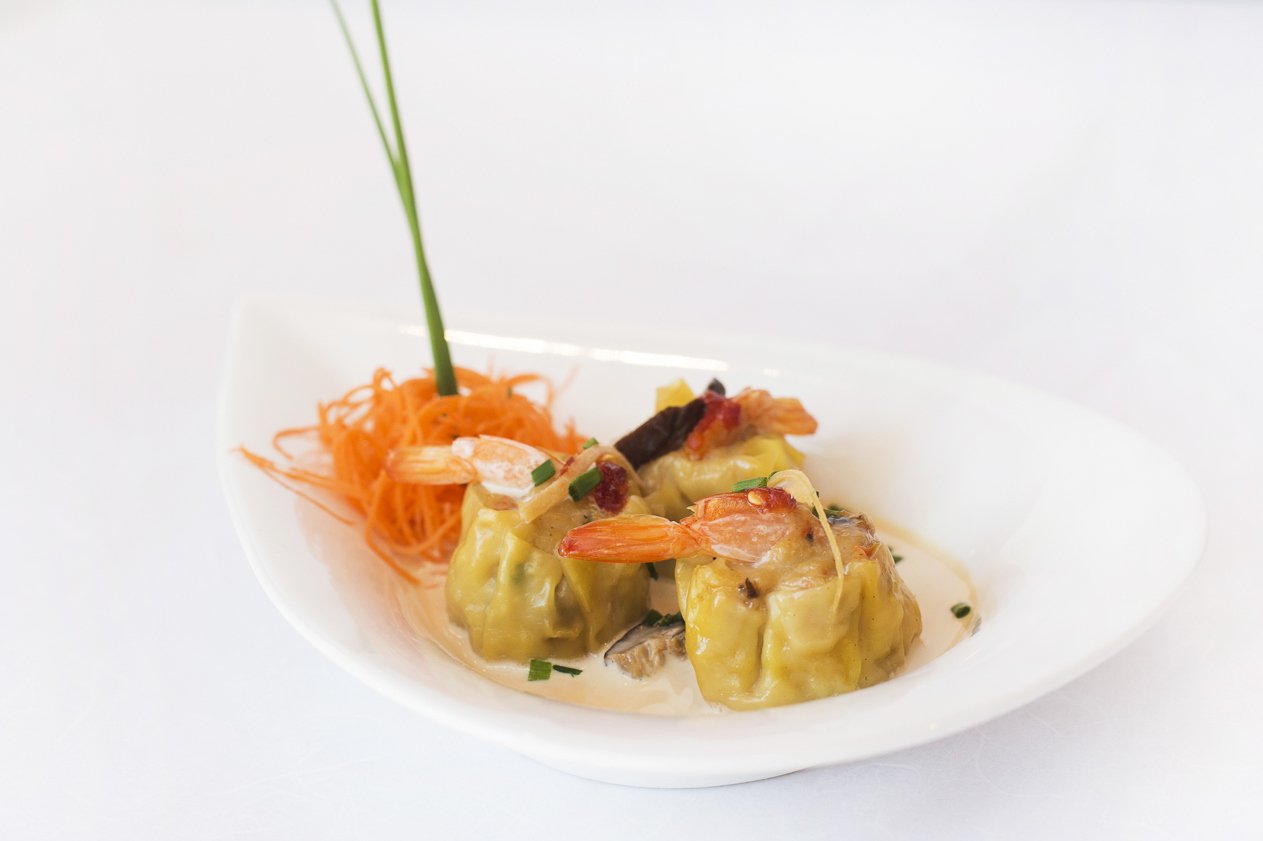Shrimp, chicken, shiitake mushrooms, carrot, ginger-lime cream.